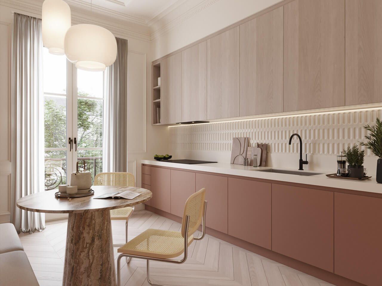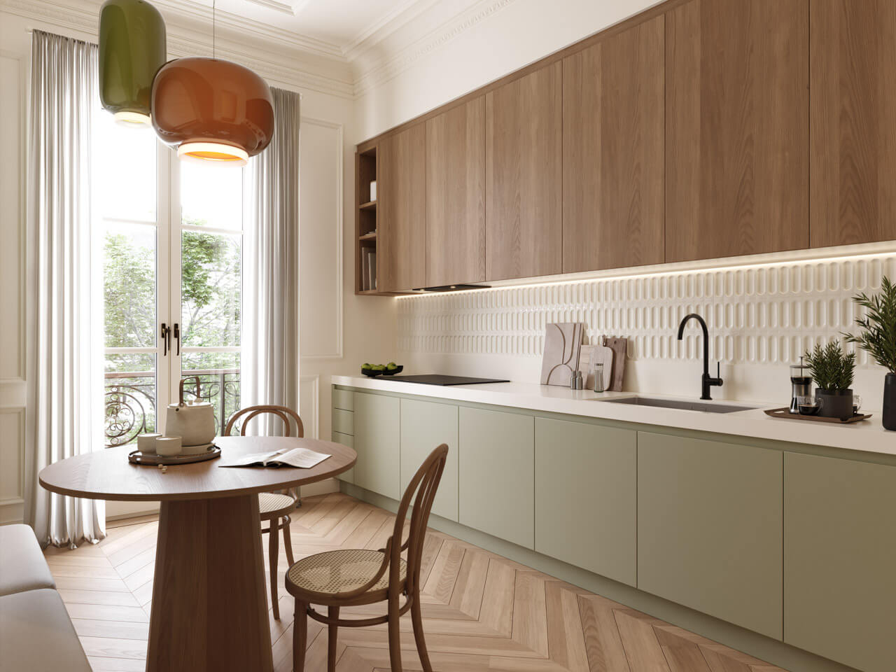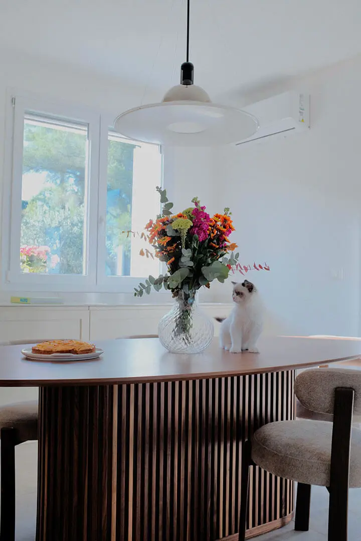 Linee moderne incontrano materiali caldi come il legno.
