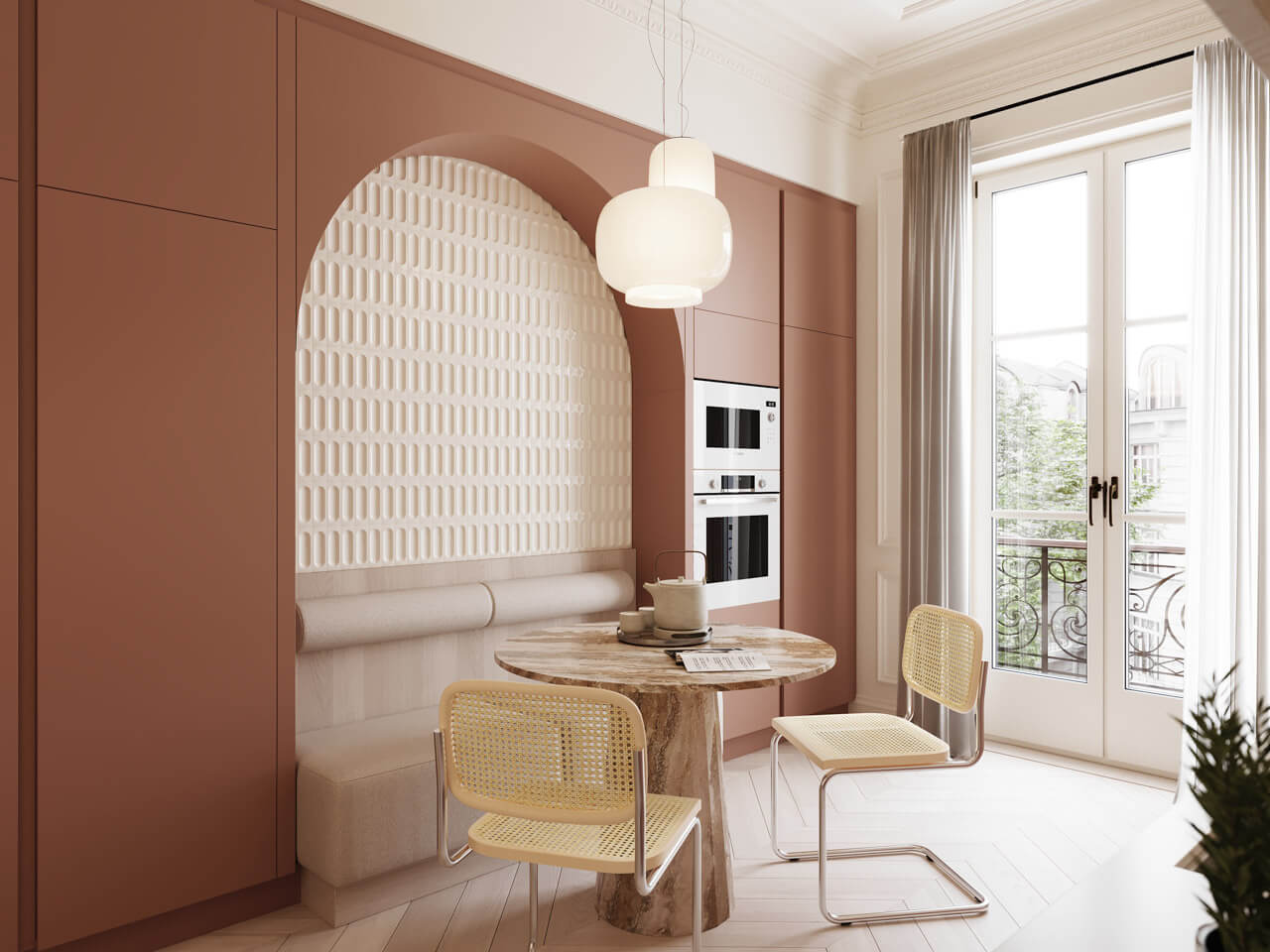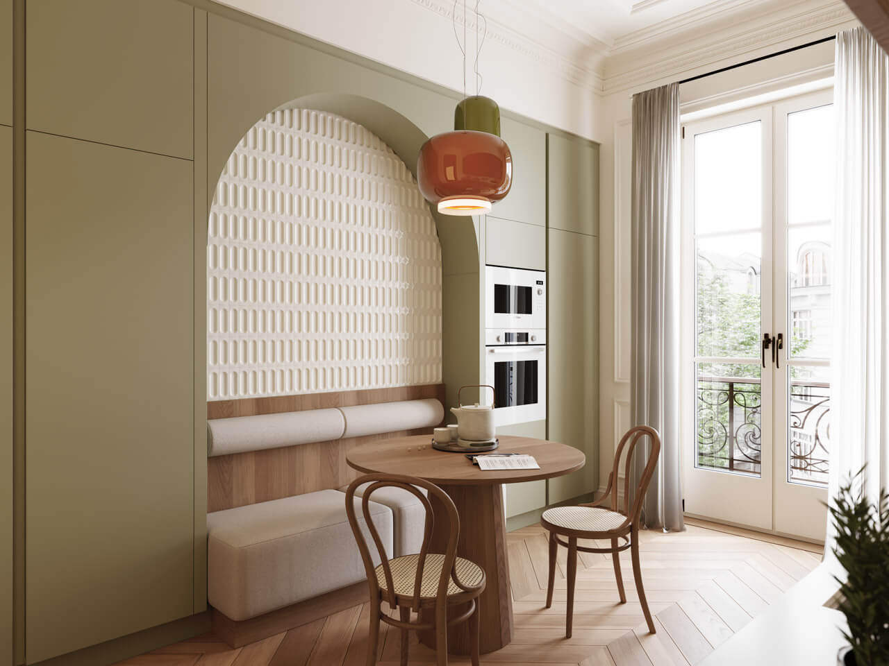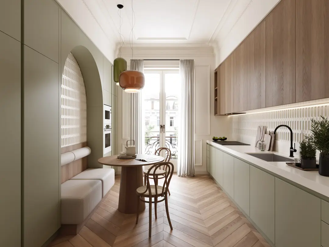 Linee moderne incontrano materiali caldi come il legno.