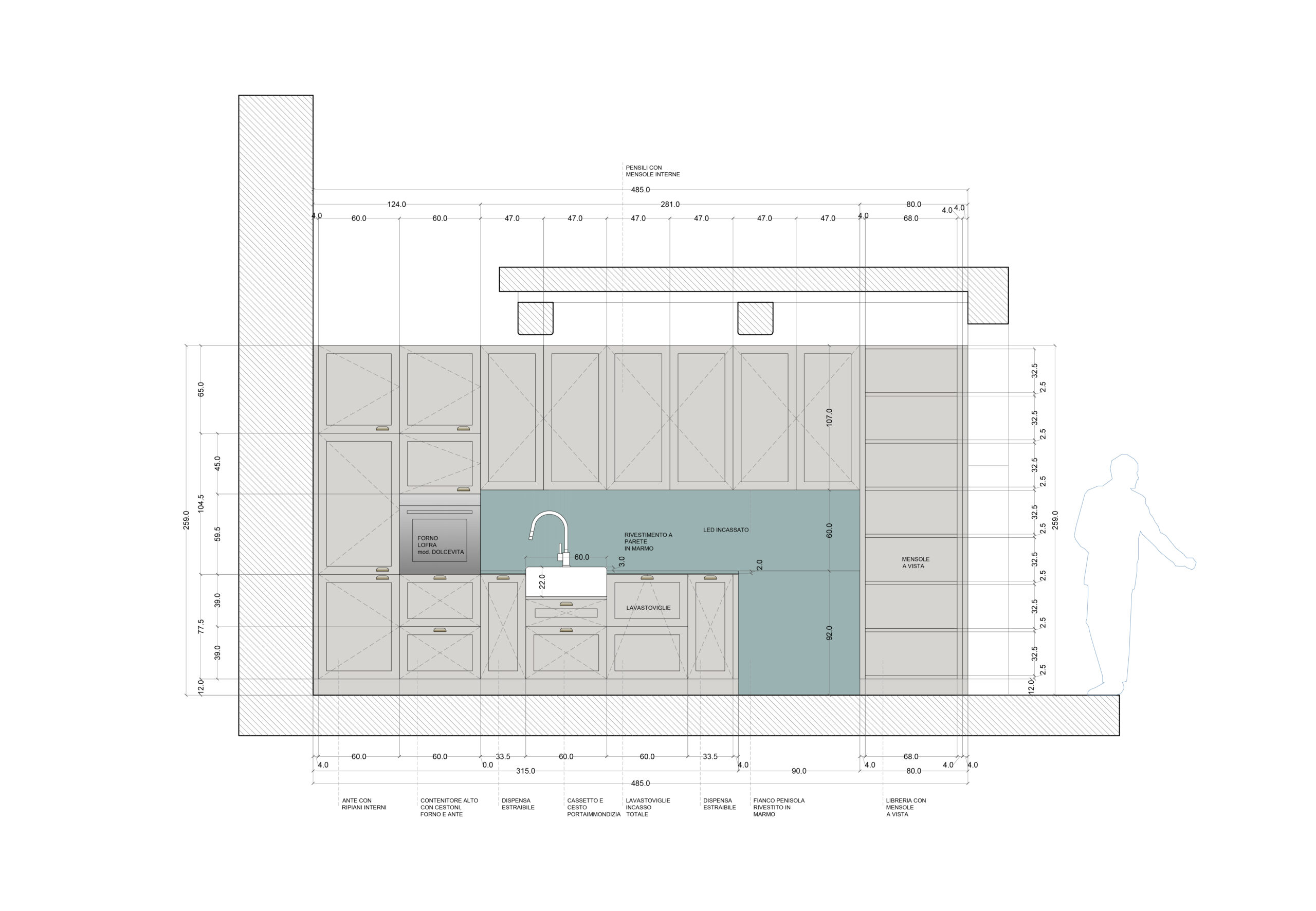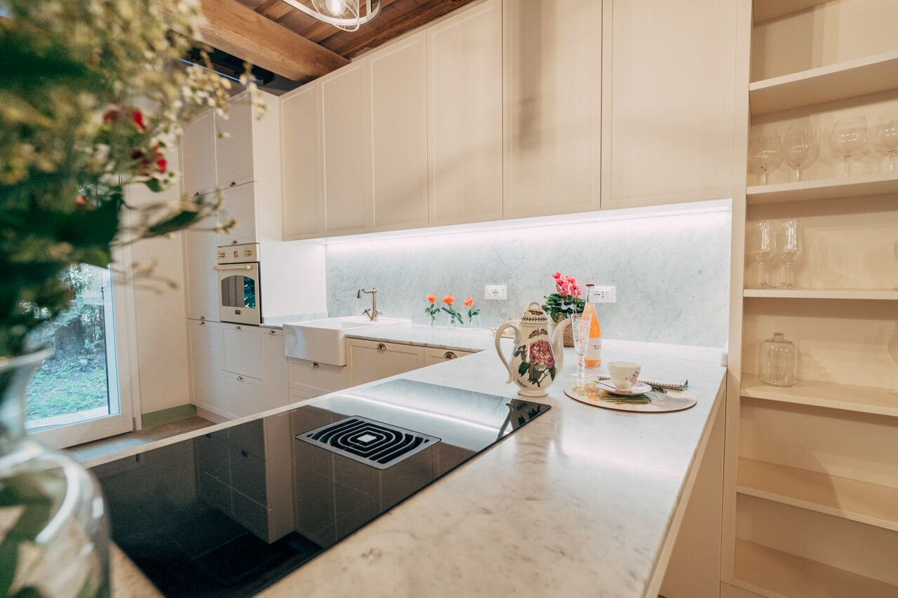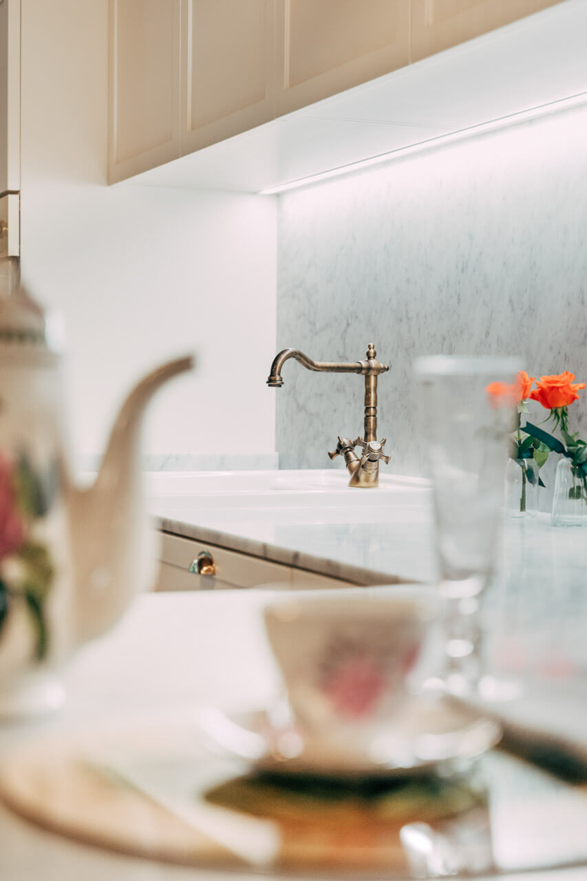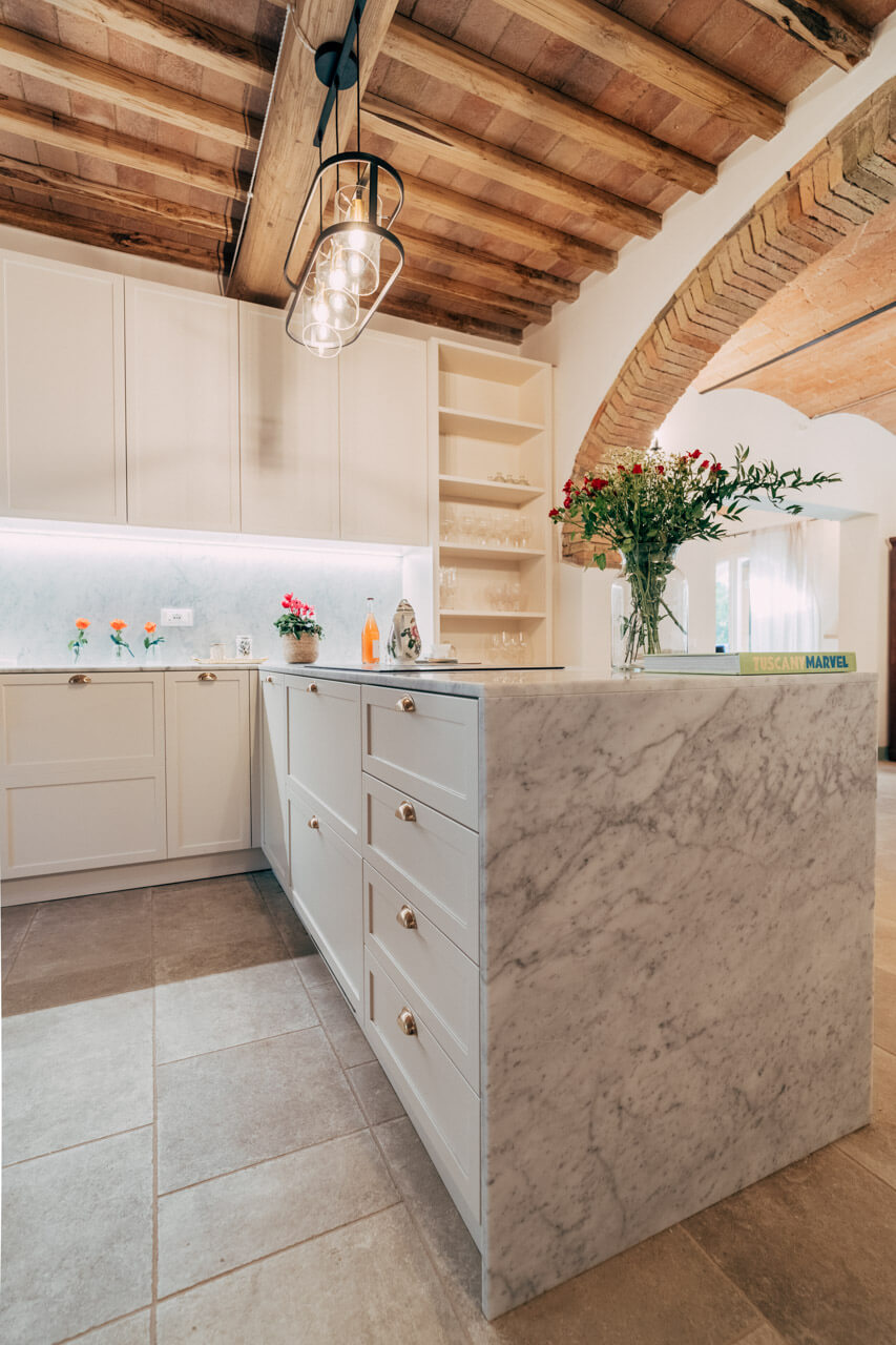 Il top della cucina nasce, dalla lavorazione naturale del Marmo di Carrara che contrasta i dettagli dorati delle finiture maniglie.