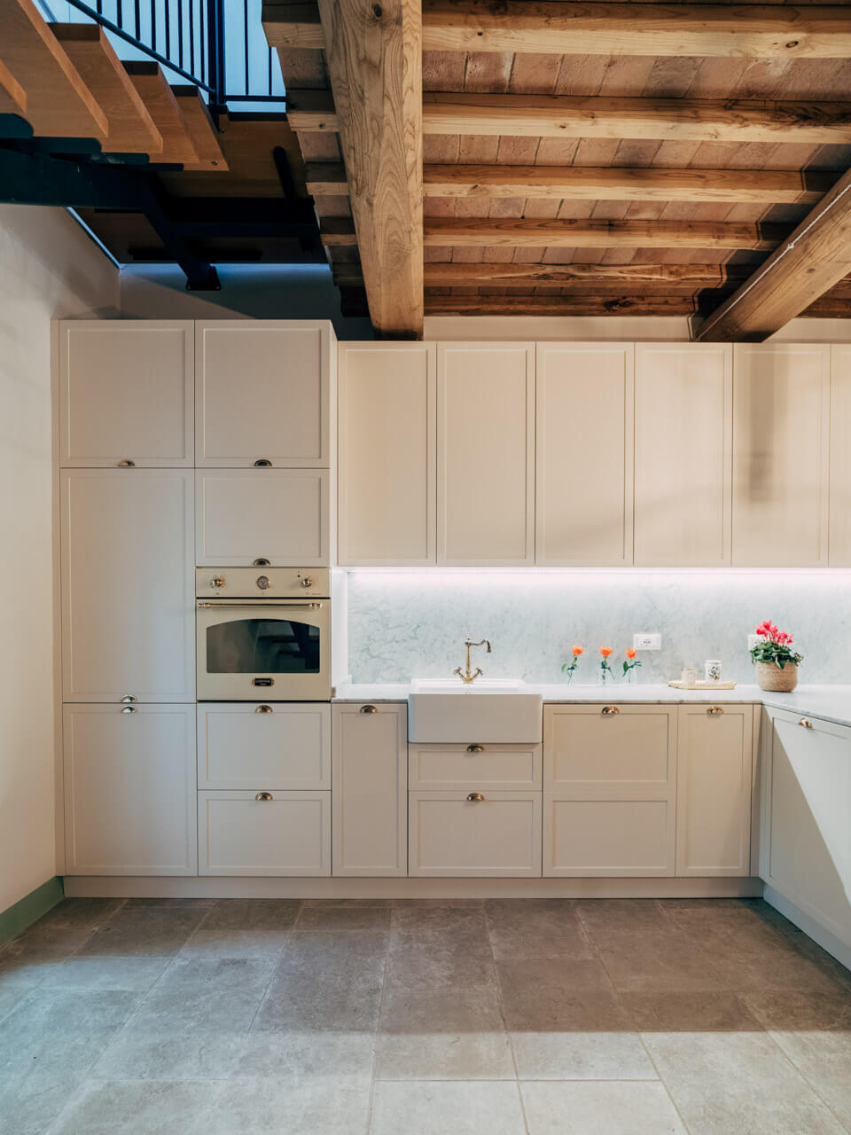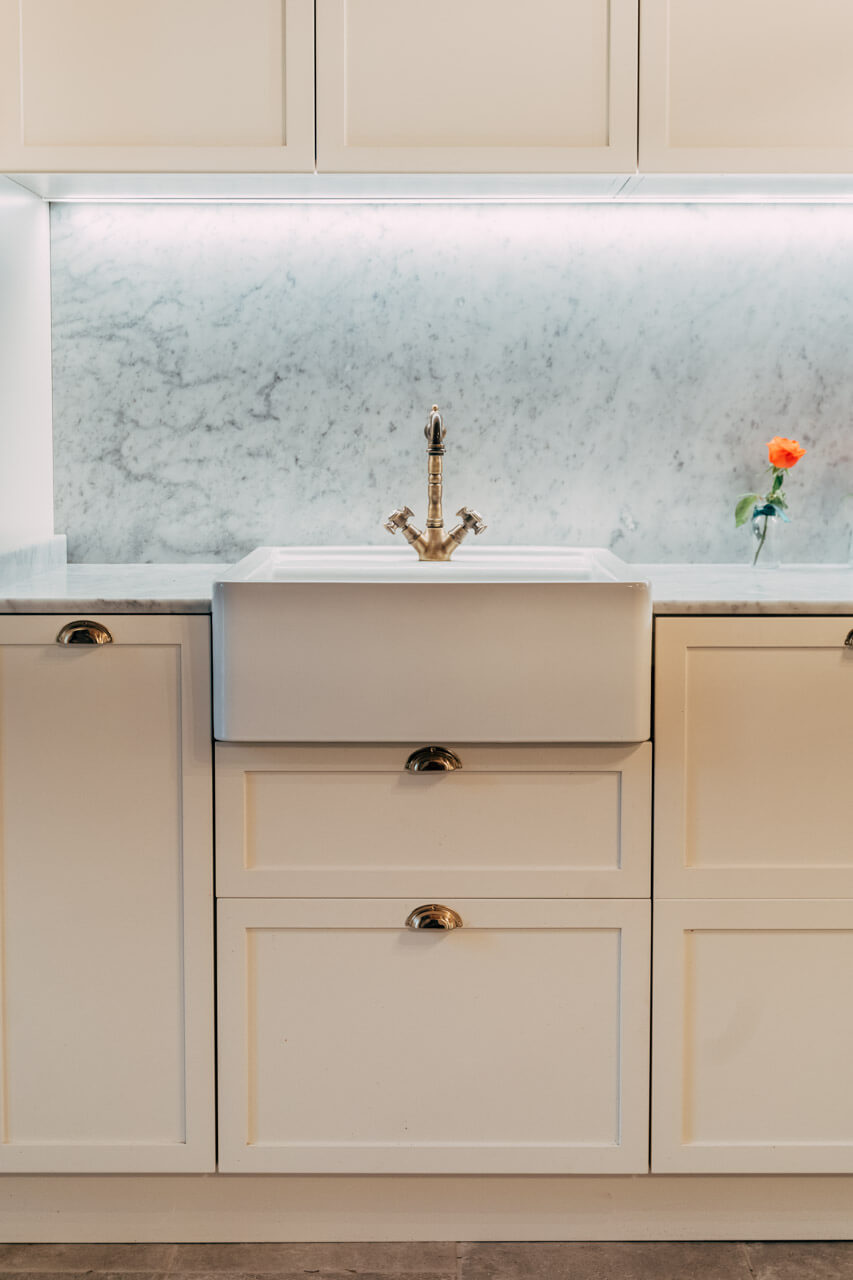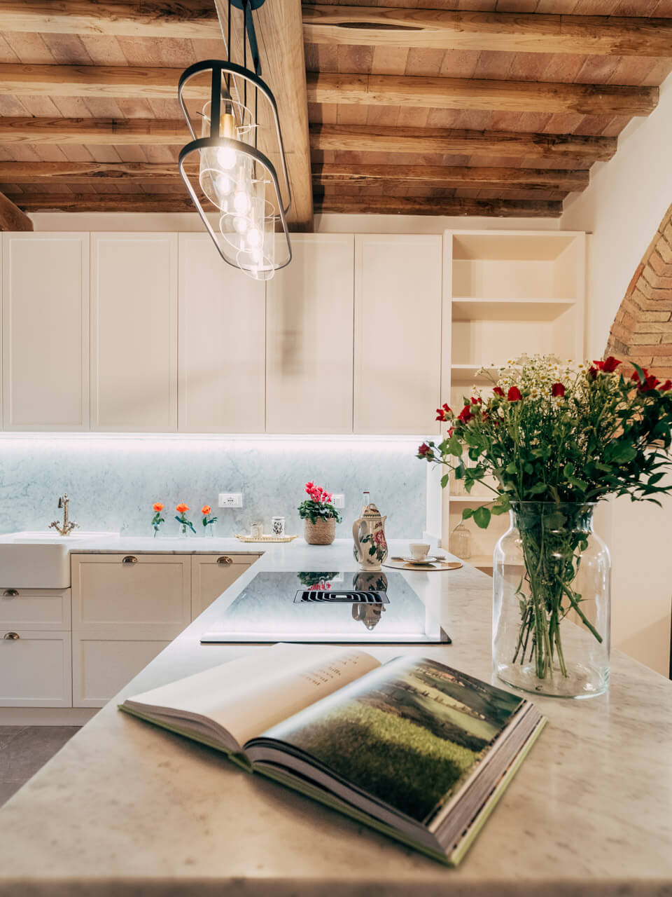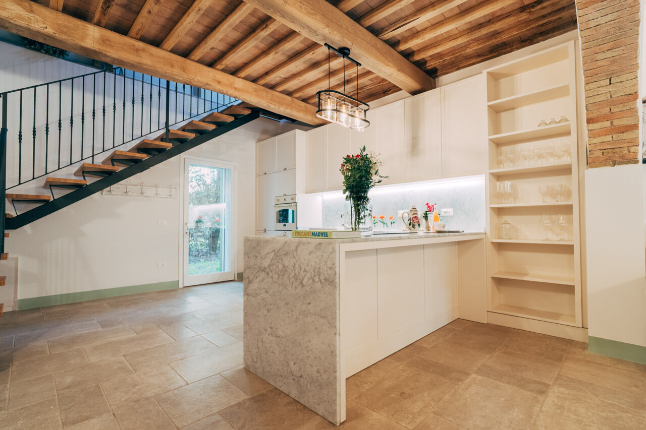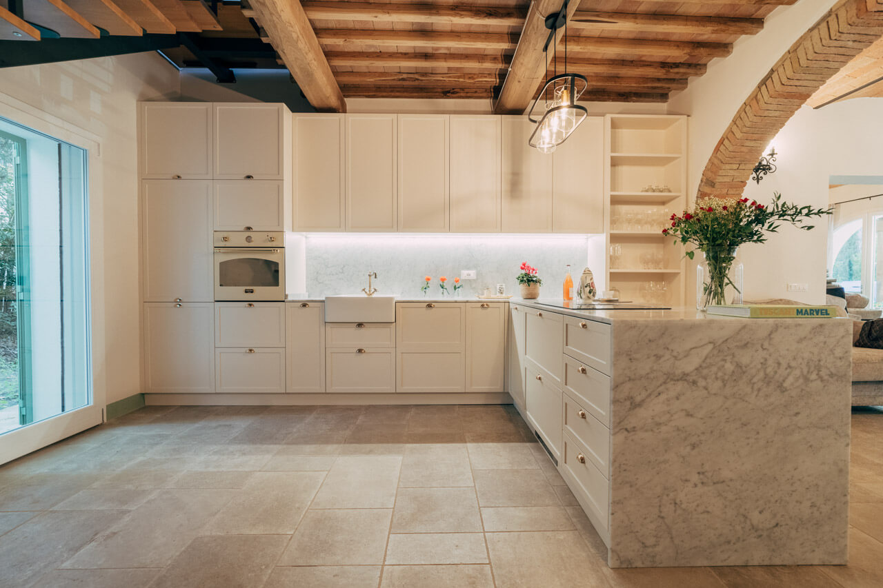 La campagna raccontata nei dettagli e finiture della cucina. Le ante bozzate portano con sé le origini inglesi all’interno della terra Toscana.