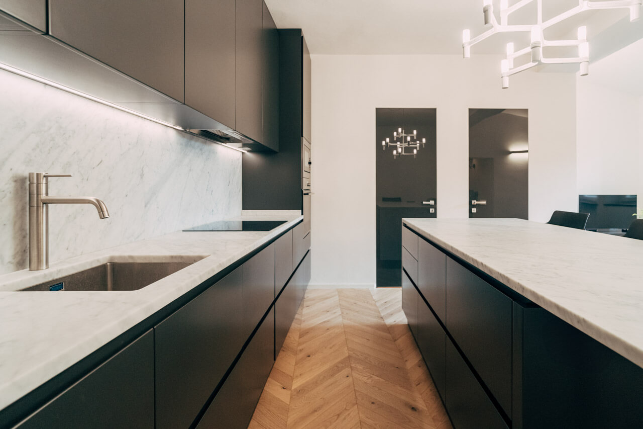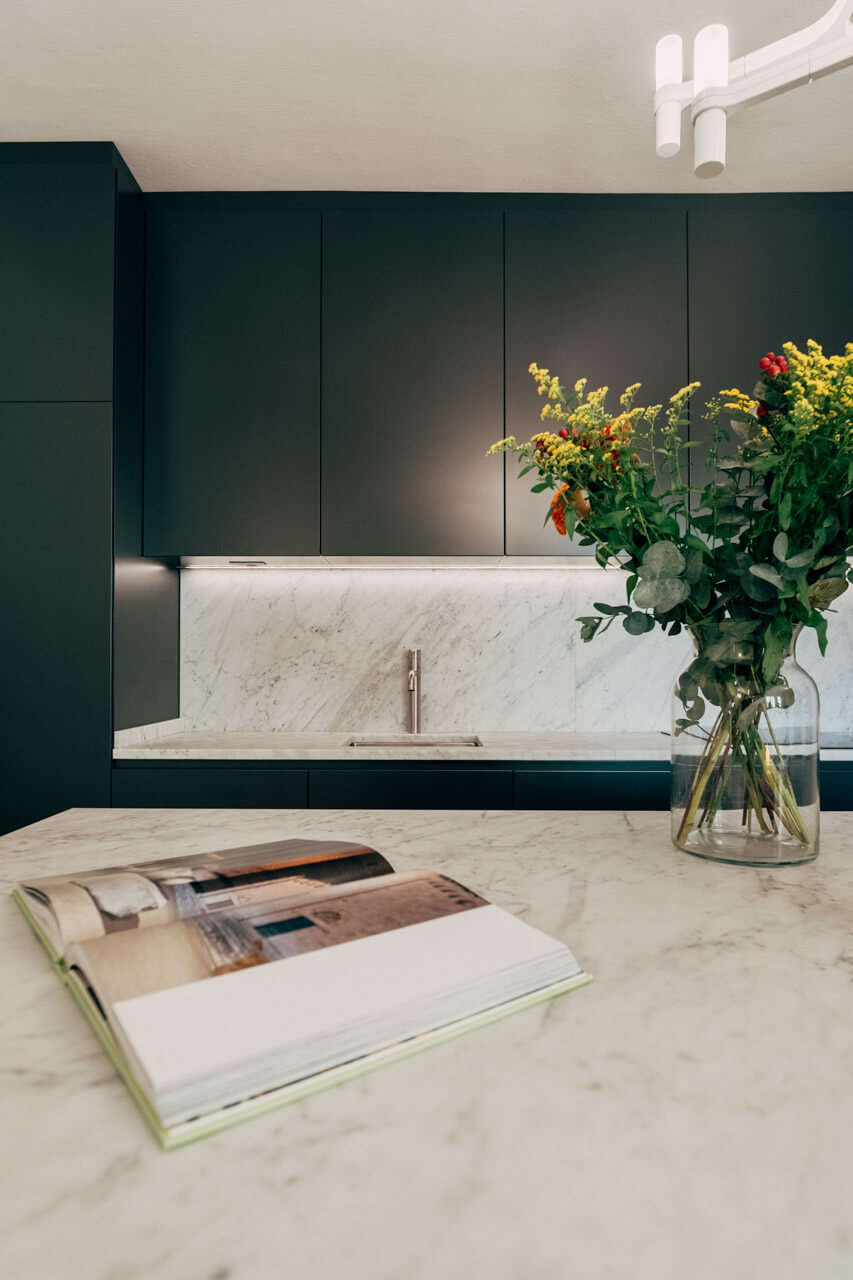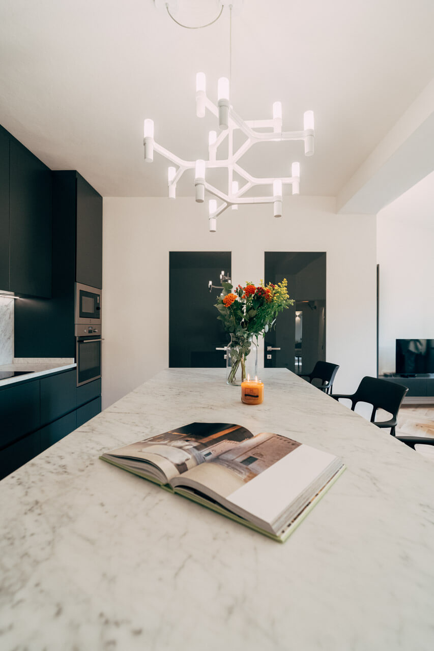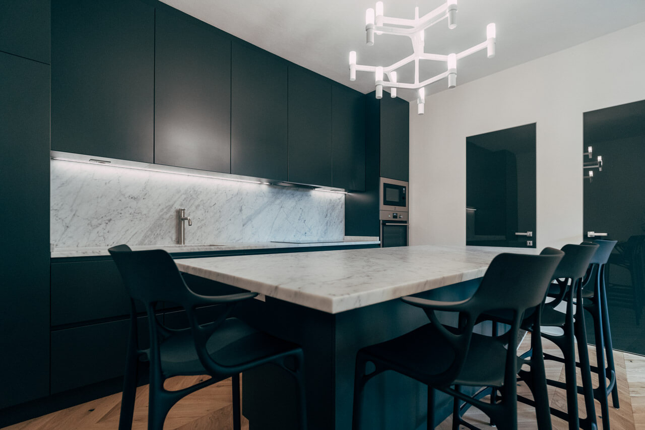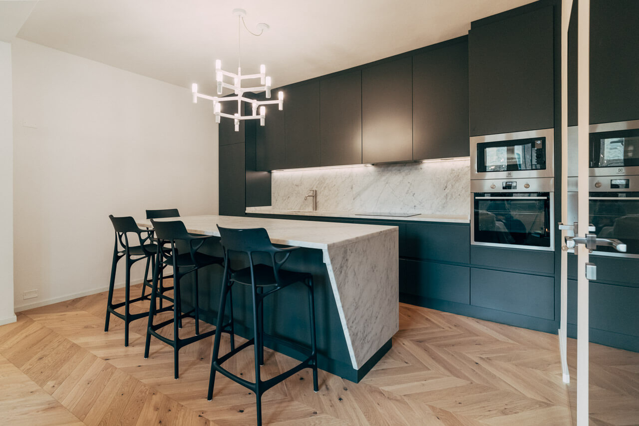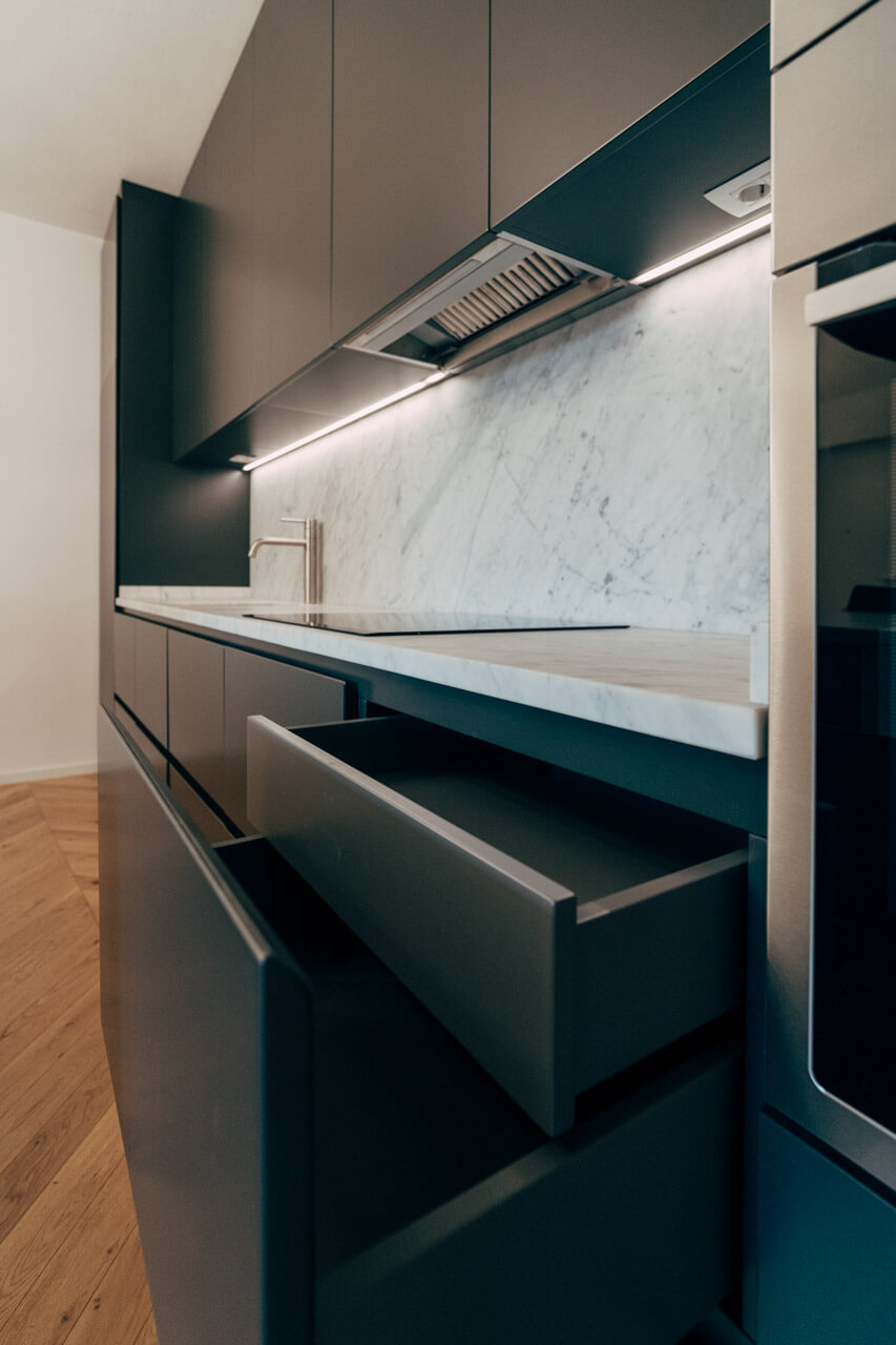 Il progetto nasce dalla ricerca di materiale naturali come il Marmo di Carrara in contrasto con il colore antracite della cucina.