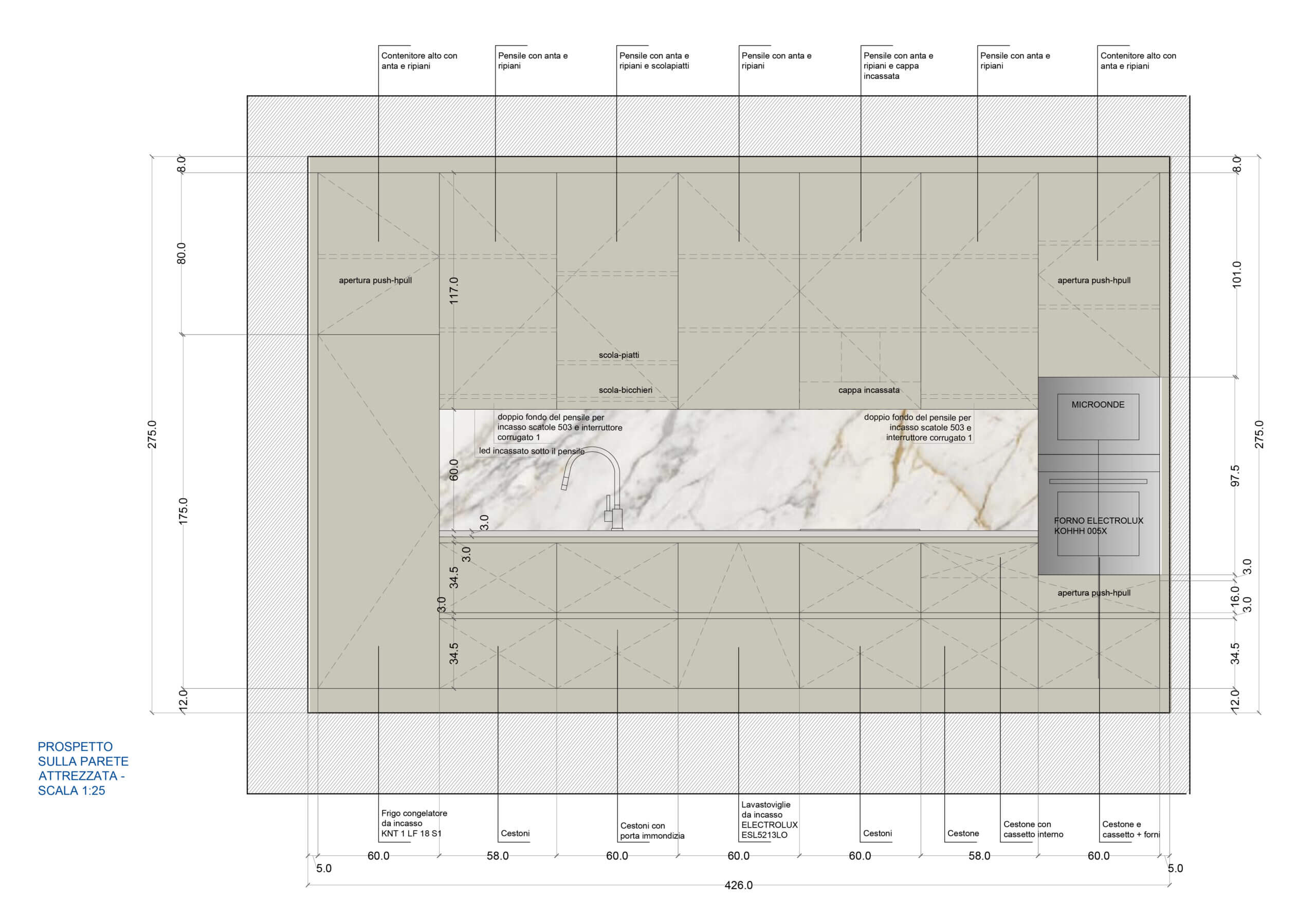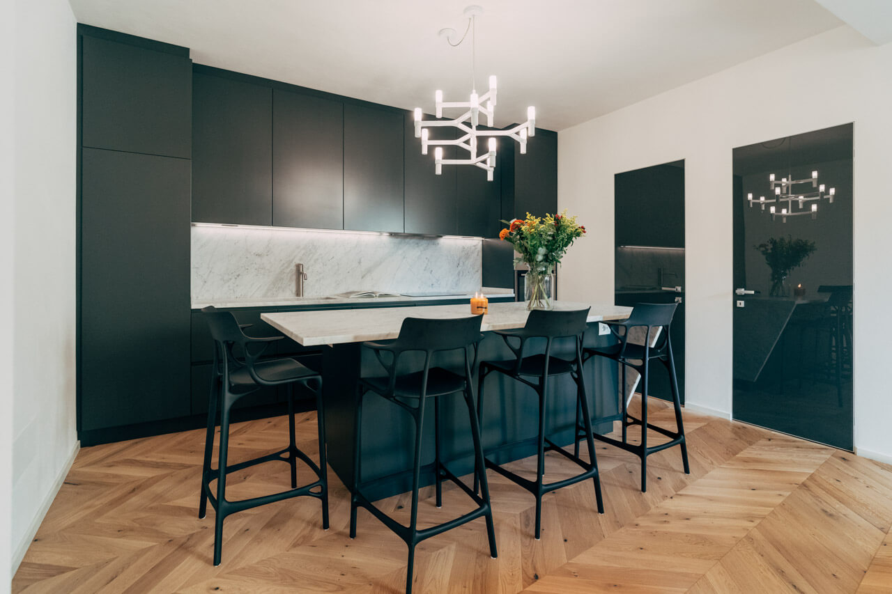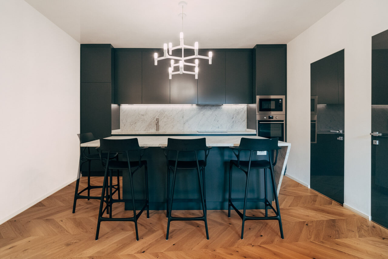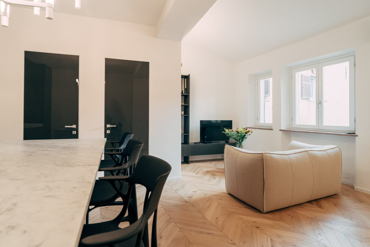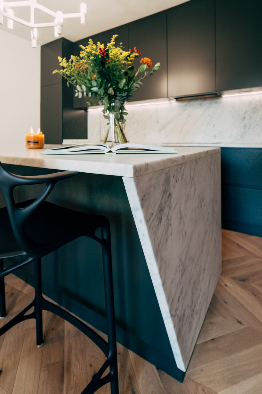 Il progetto nasce dalla ricerca di materiale naturali come il Marmo di Carrara in contrasto con il colore antracite della cucina.
