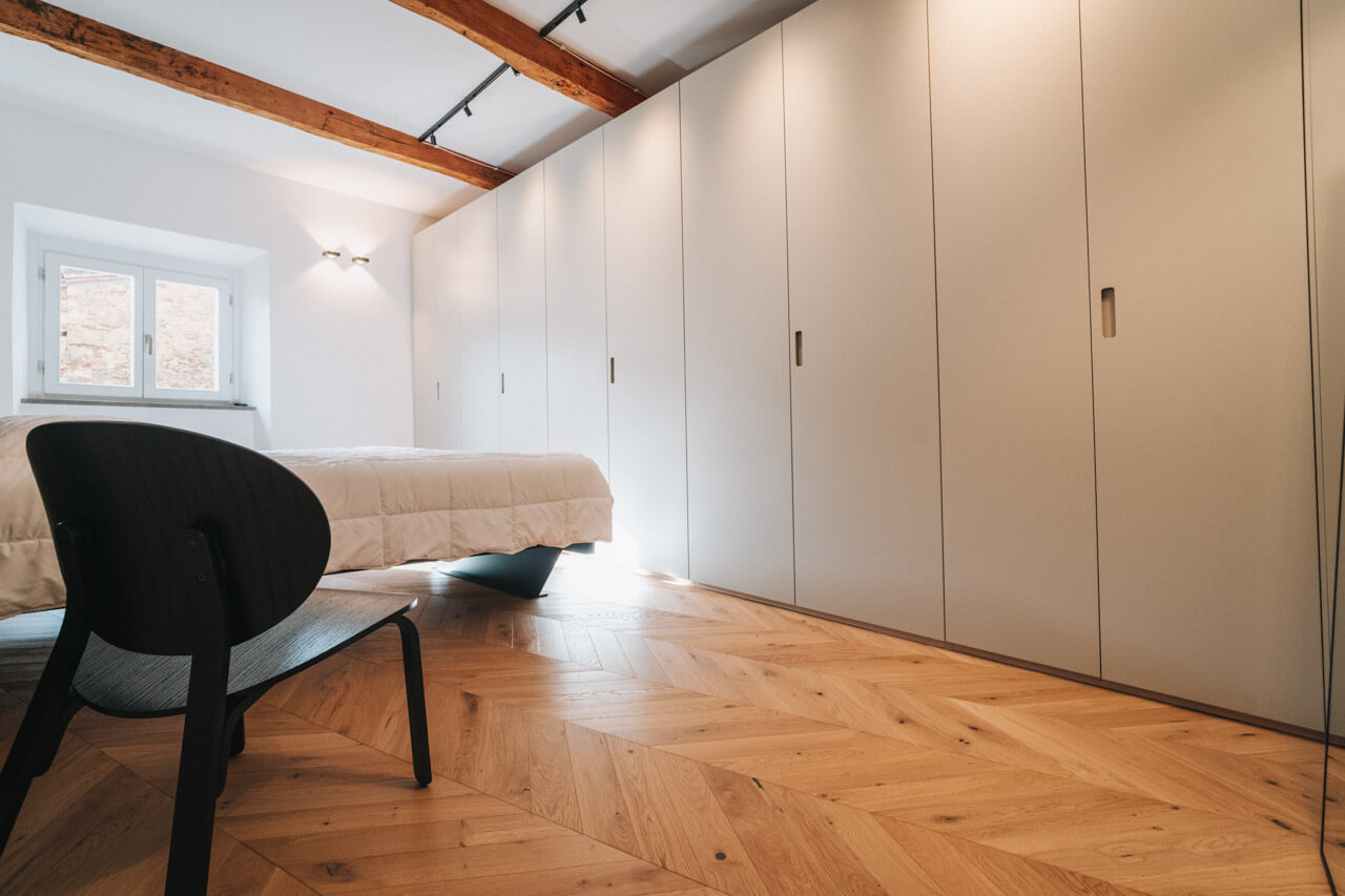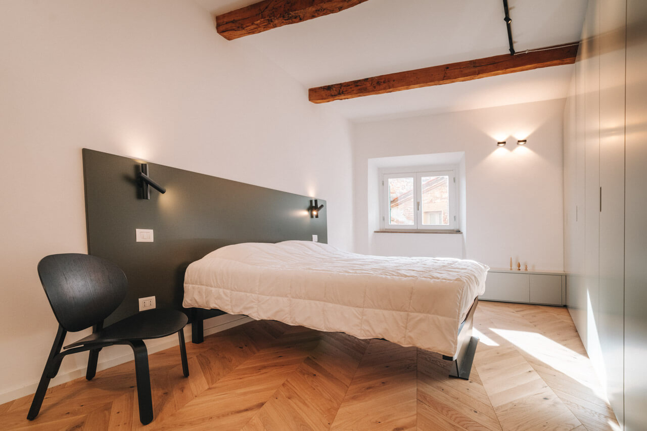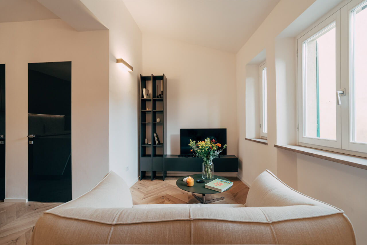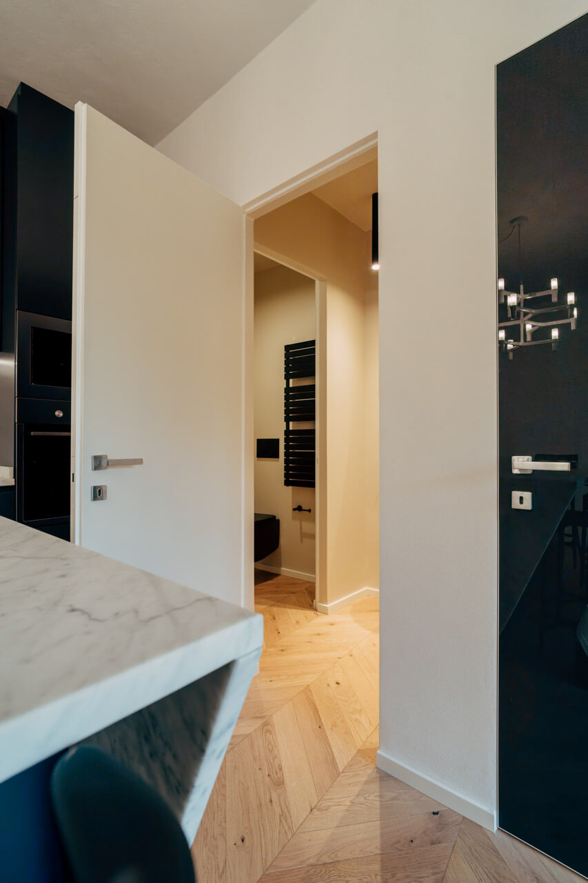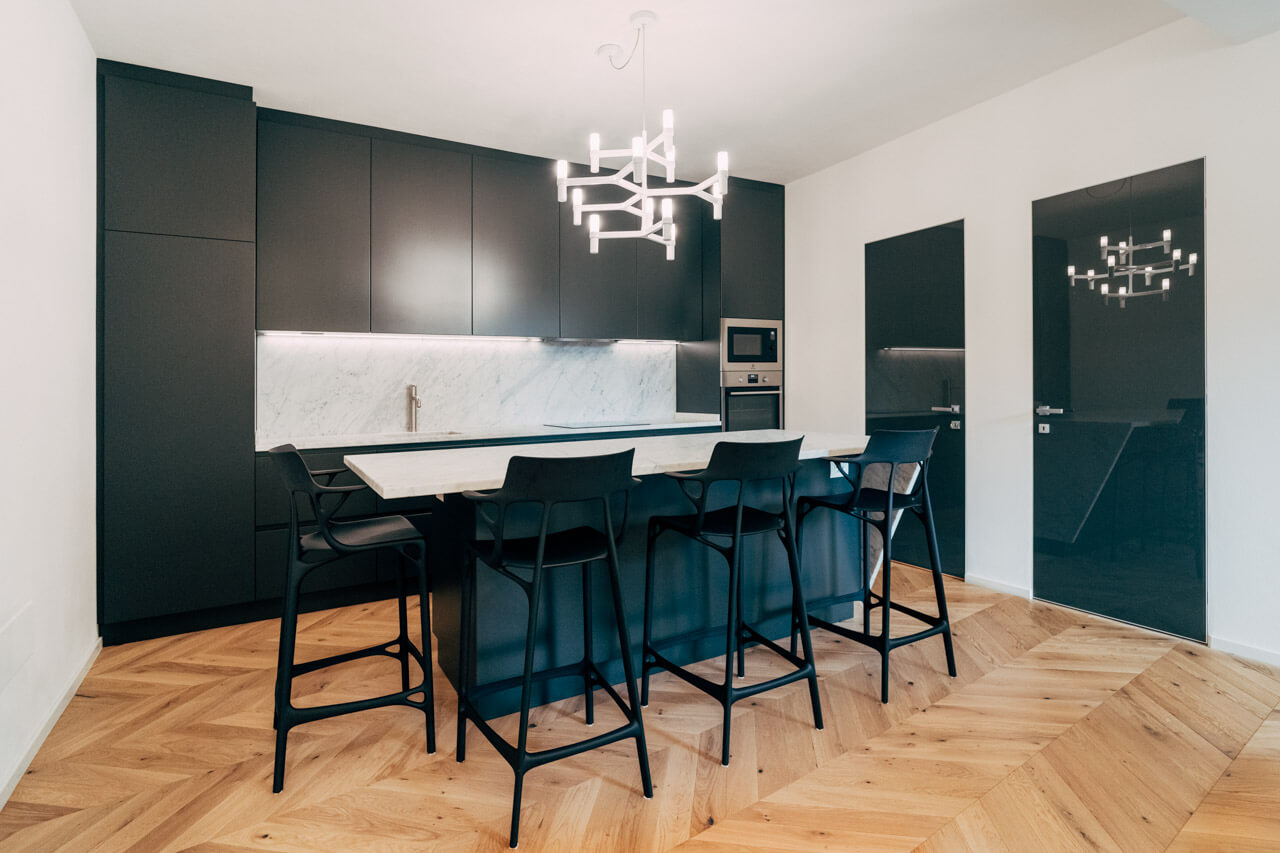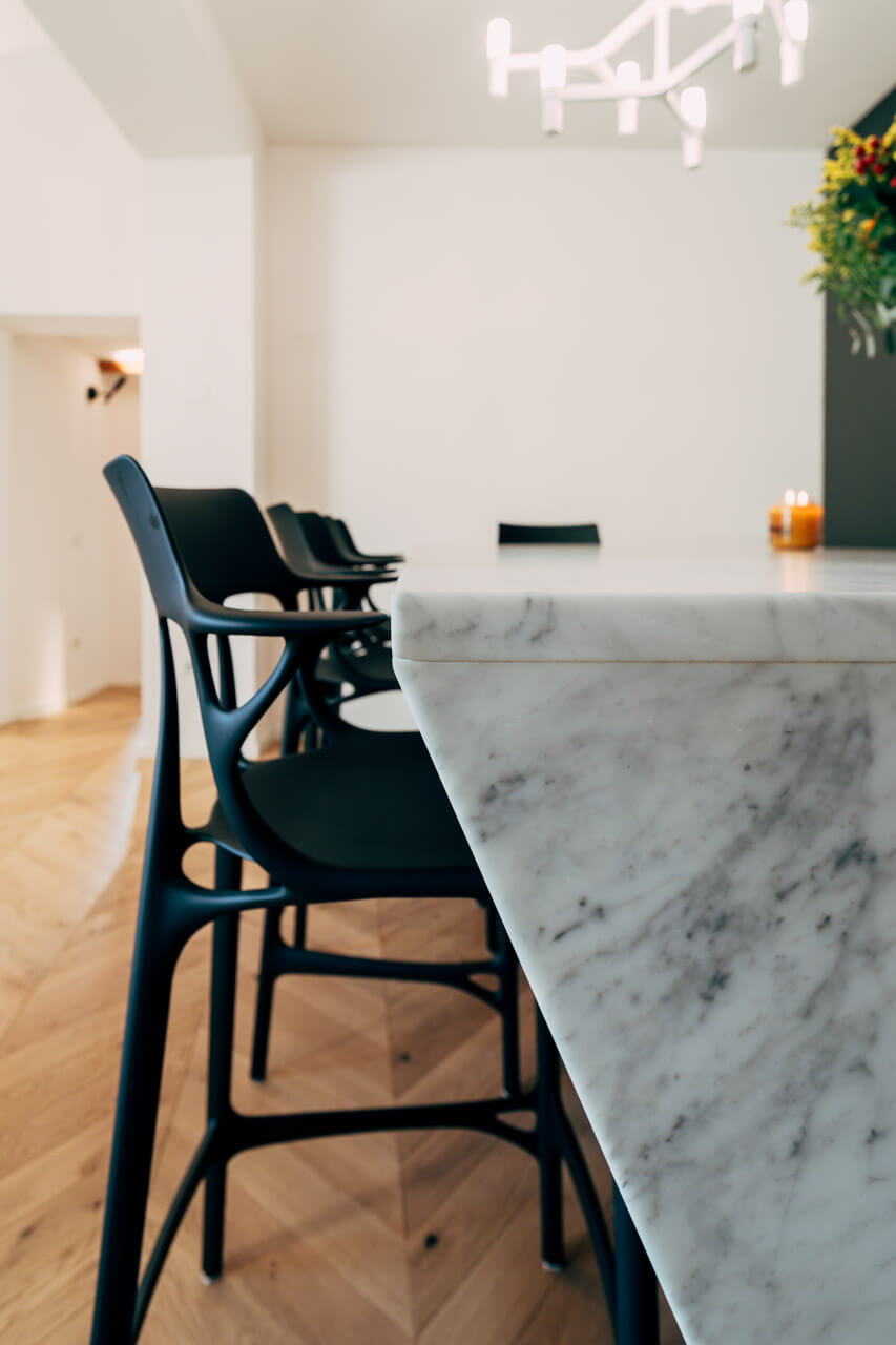 Il progetto nasce dalla ricerca di materiale naturali come il Marmo di Carrara in contrasto con il colore antracite della cucina.