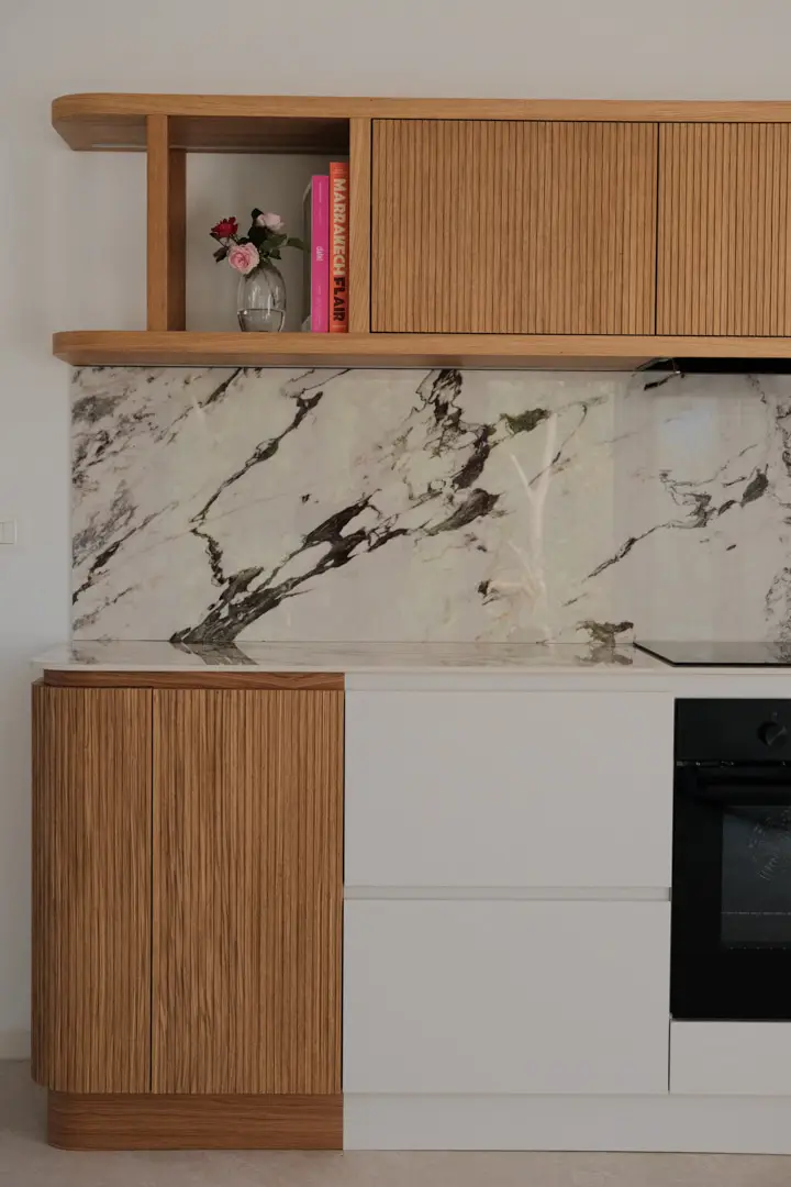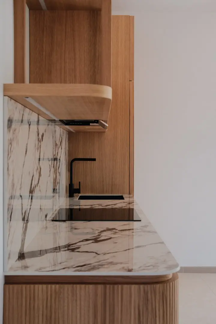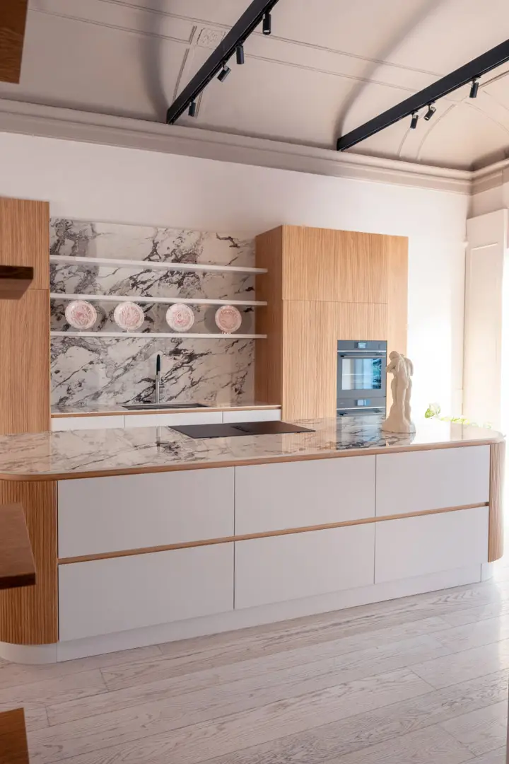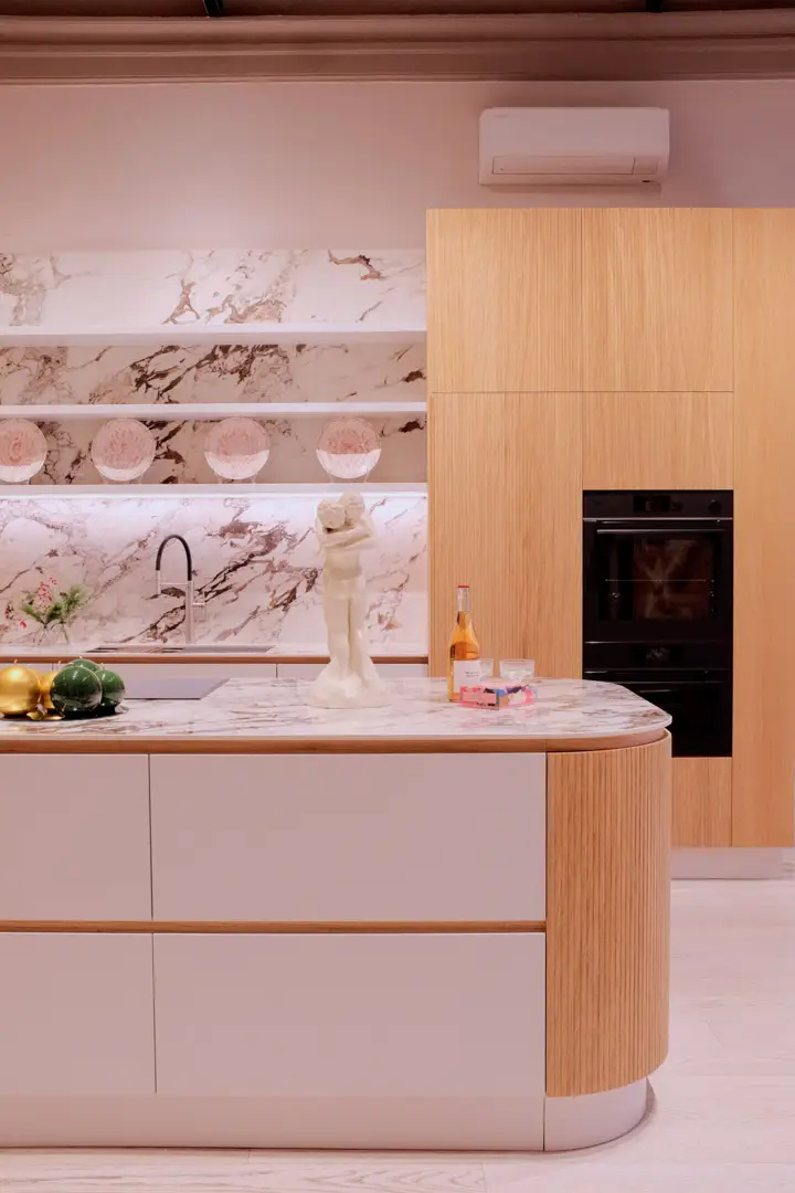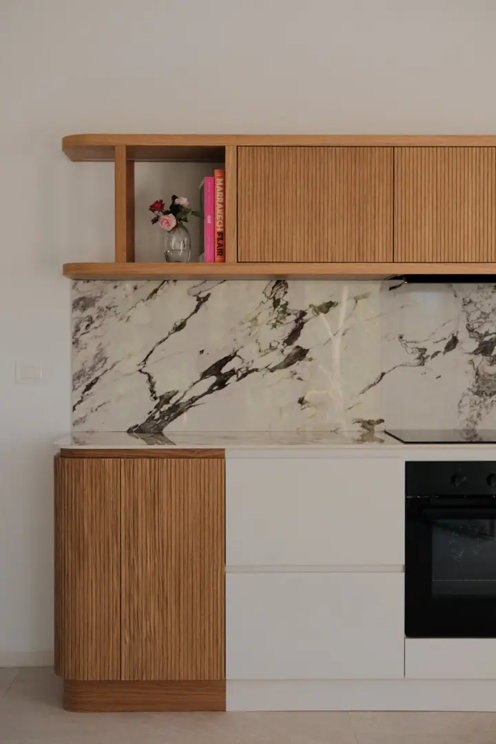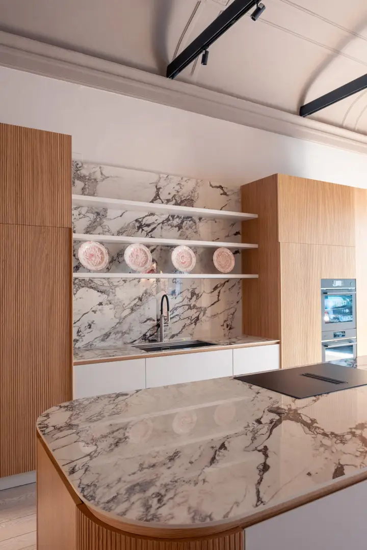 Gioca con la luce scegliendo colori chiari e un top in gres porcellanato effetto marmo.