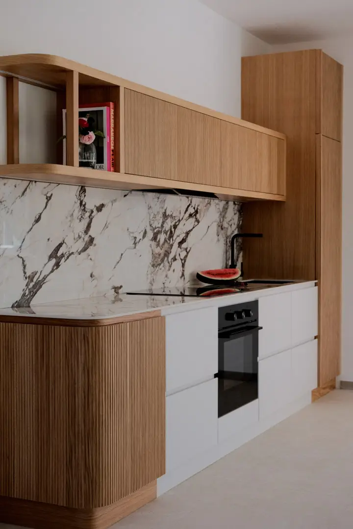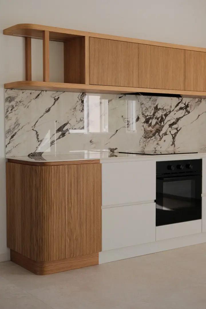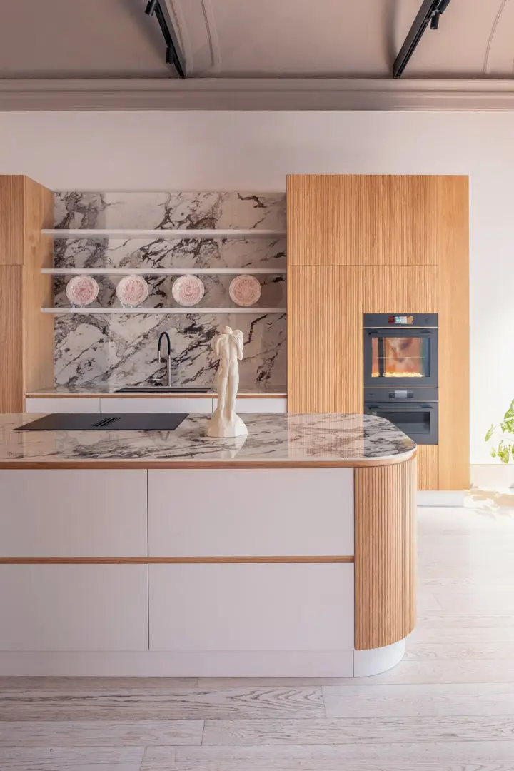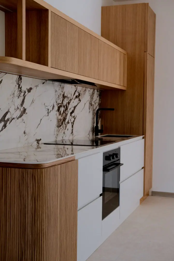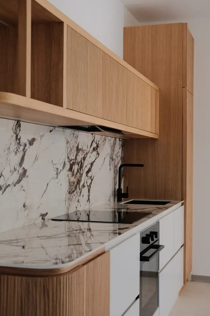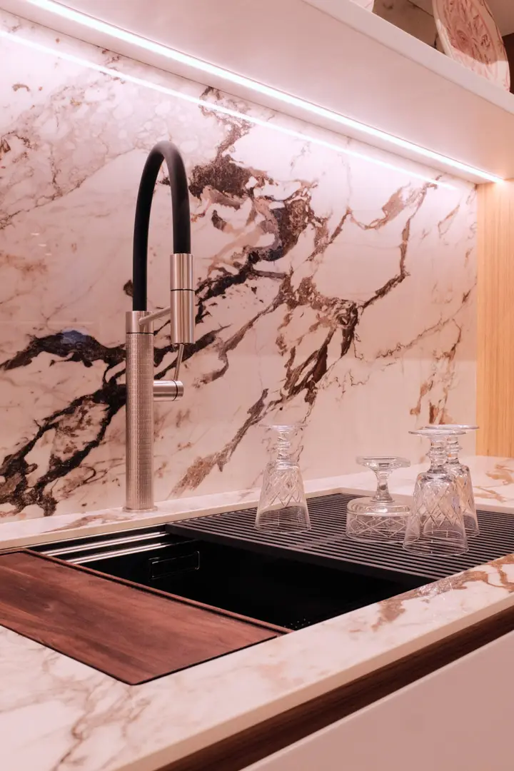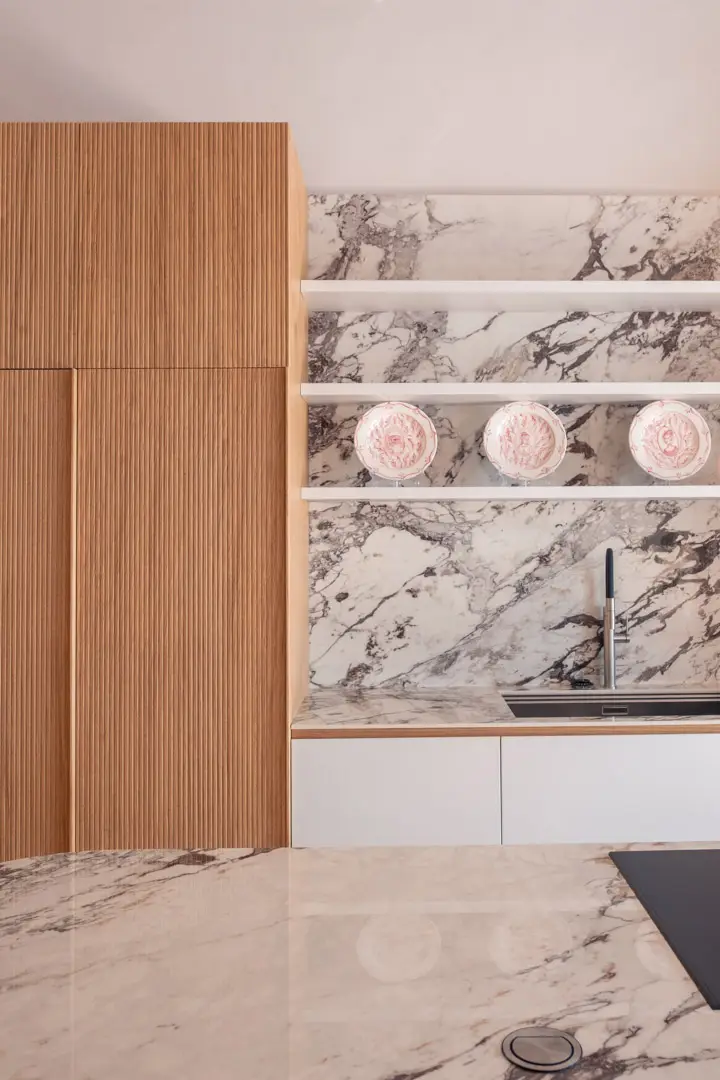 Gioca con la luce scegliendo colori chiari e un top in gres porcellanato effetto marmo.