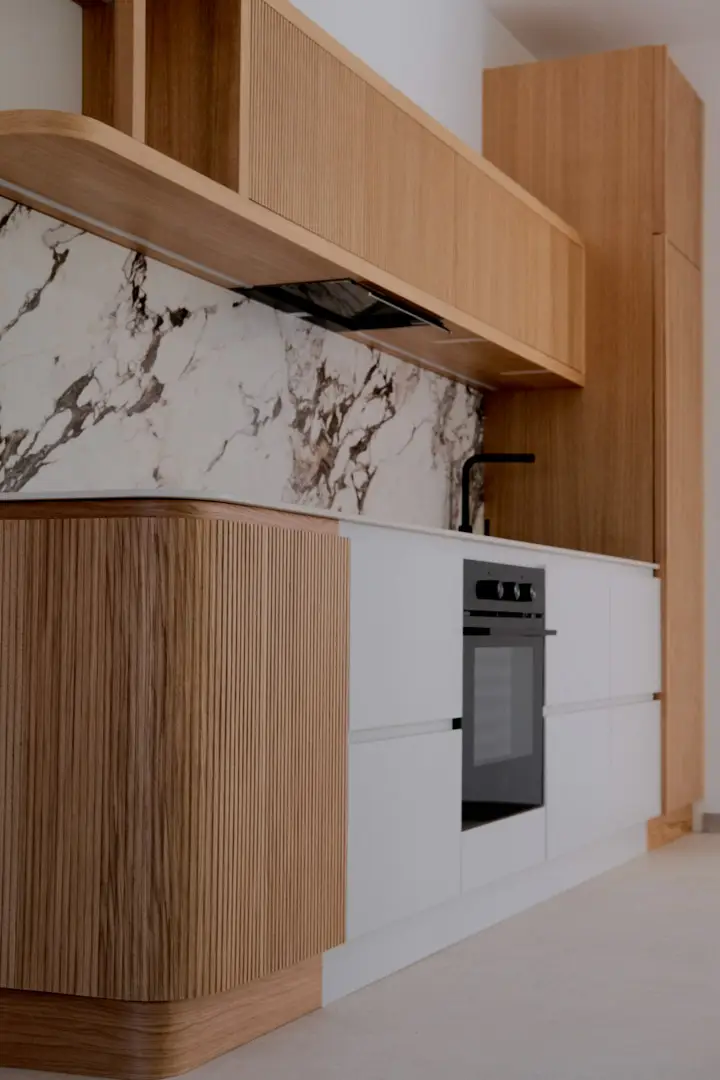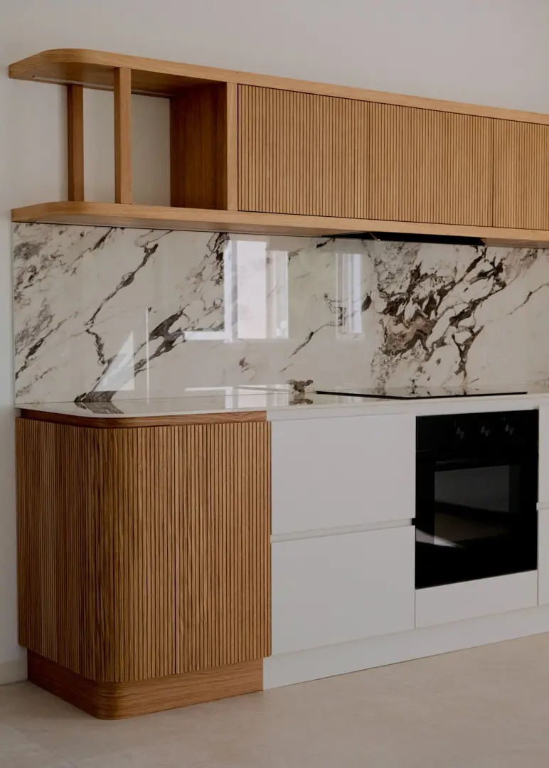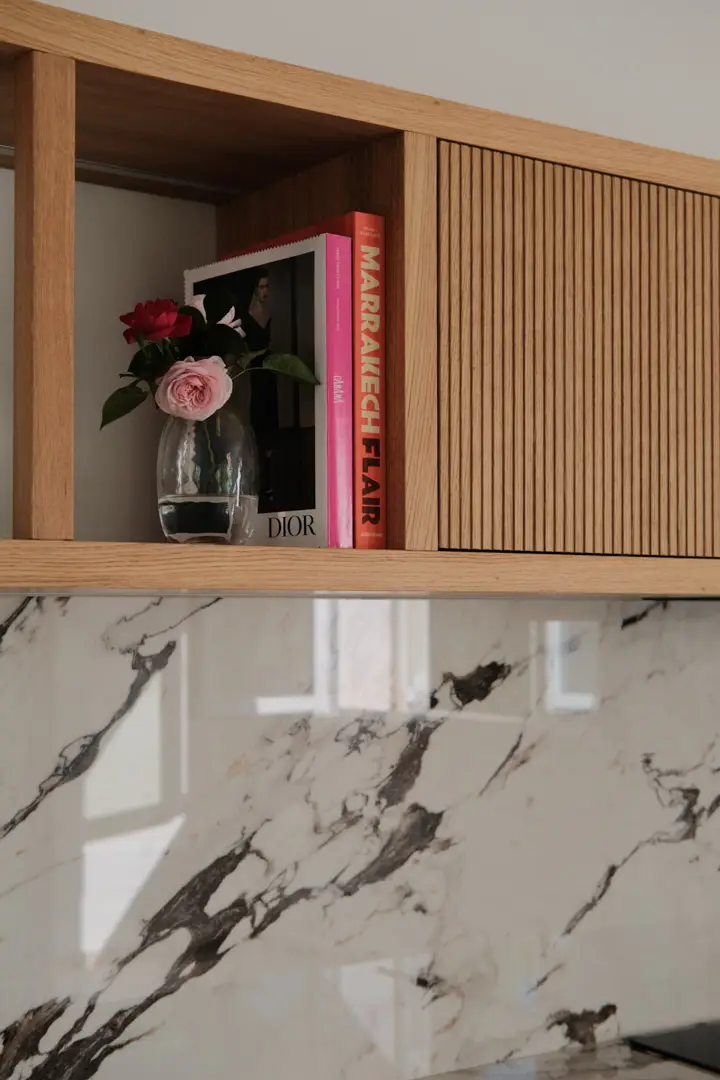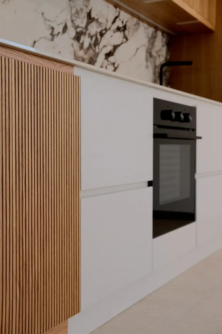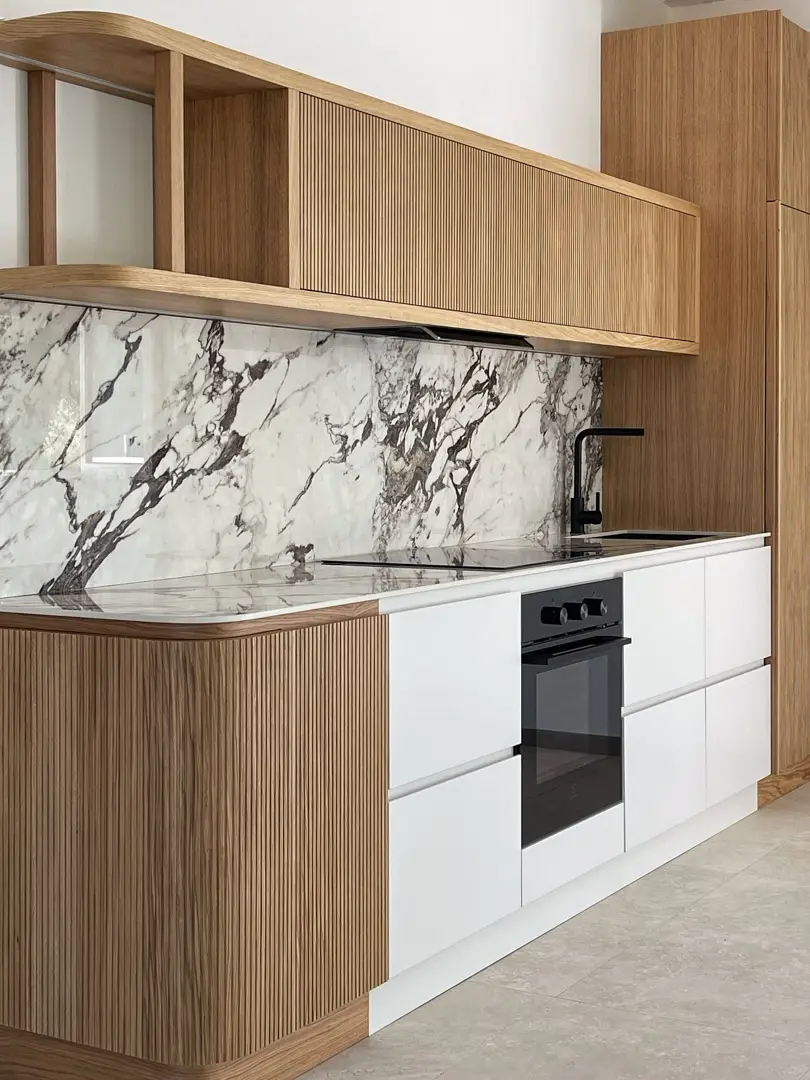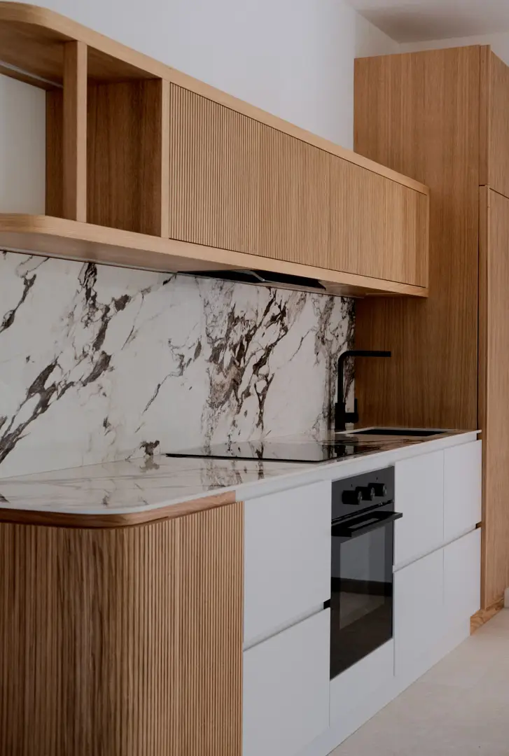 Gioca con la luce scegliendo colori chiari e un top in gres porcellanato effetto marmo.